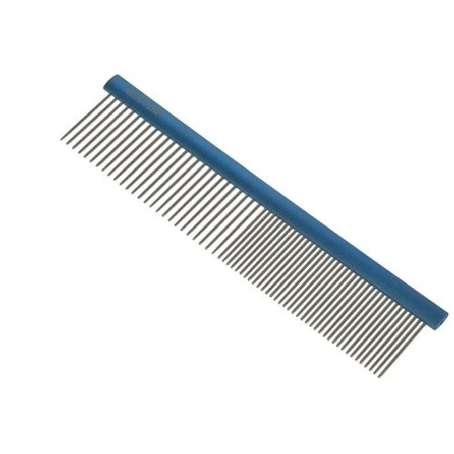 Handige vachtkam met RVS-greep of aluminium greep geschikt voor het trimmen van honden. De vachtkam is leverbaar in meerdere varianten.