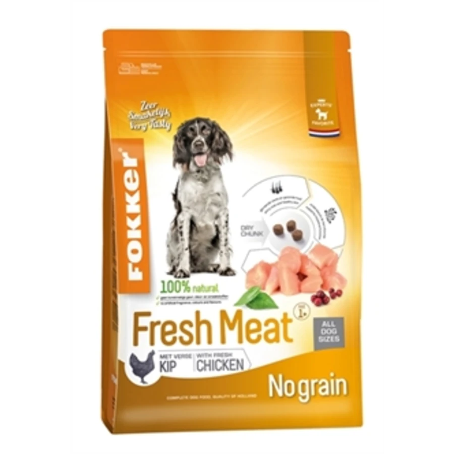 Fokker +Fresh Meat is een complete high premium hondenvoeding voor volwassen honden met 35% kip, waarvan maar liefst 20% verse kip. Fokker +Fresh Meat is volledig vrij van granen (0%) en daardoor tevens gluten(allergie)vrij. Fokker +Fresh Meat bevat (zoete) aardappels, groenten en vruchten en is daardoor gezond en beschermend. Hoogwaardige Noorse zalmolie, net als lijnzaad een bron van omega 3-6 vetzuren, geeft optimale ondersteuning voor een volle en glanzende vacht. De toevoeging van chondroïtine en glucosamine ondersteunt de bescherming van het kraakbeen. Dit kwaliteitsproduct heeft een zeer hoge verteerbaarheid. De hierdoor beperkte hoeveelheid ontlasting is door het gebruik van Yucca nagenoeg reukloos. Fokker +Fresh Meat is het beste dat jij jouw hond kunt bieden.