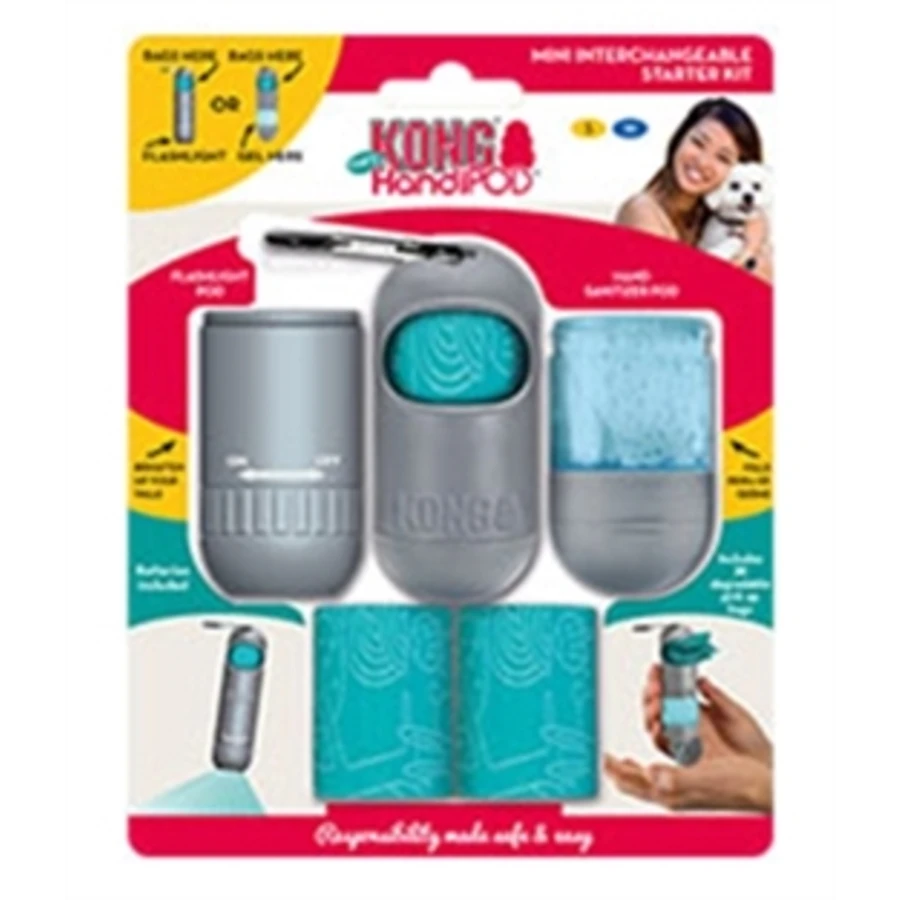 De KONG Handipod Mini Starter Kit voor de hond is een poepzakjeshouder met verwisselbare zaklamp en tube desinfectiemiddel. Zo kun je altijd kiezen wat het beste bij jouw situatie op het moment past! De poepzakjeshouder heeft een handige opening aan de voorzijde zodat je de zakjes kunt pakken en afscheuren zonder de houder open te maken: de zakjes zijn bovendien stevig, biologisch afbreekbaar en voorzien van een handige sluitstrip.