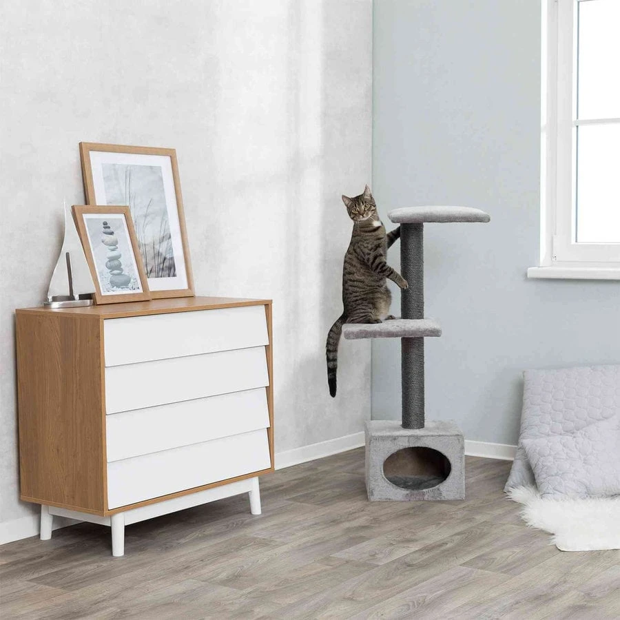 Een krabpaal waar behalve krabben ook dutjes in gedaan kunnen worden