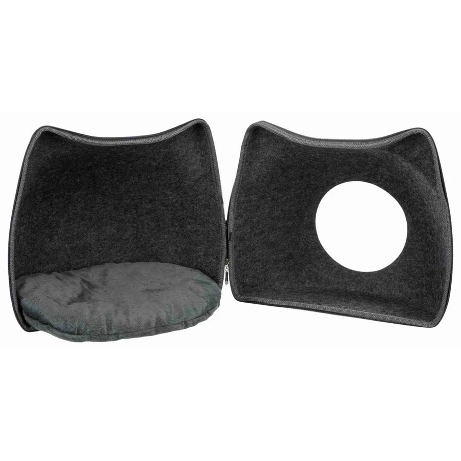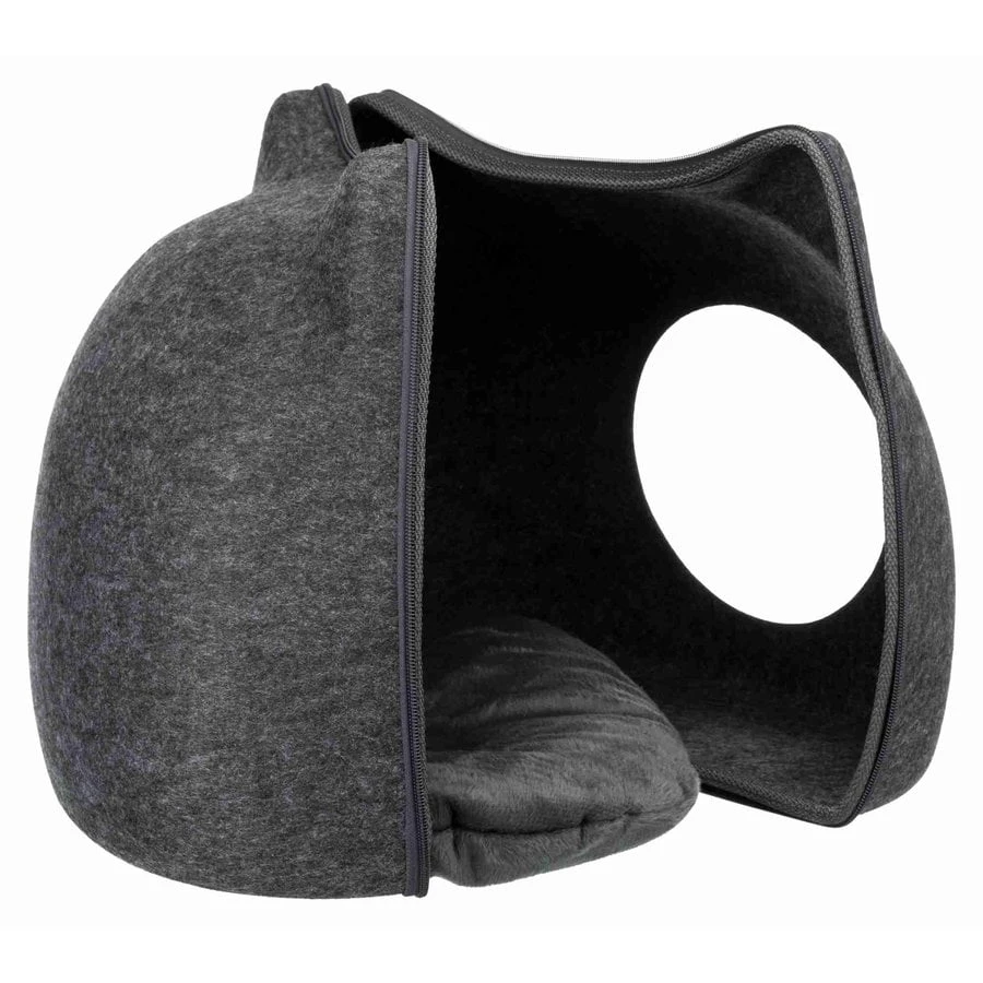Schuilplaats Cat is een zachte plek waar uw kat kan rusten of slapen. Dit bed is gemaakt van vilt (polyester) en het kussen is gemaakt met pluche bekleding (polyester) en bevat doorgestikt polyestervlies vulling. Daarnaast is de schuilplaats helemaal te openen dankzij de ritssluiting. Het bed is met de hand te wassen en is vormvast.