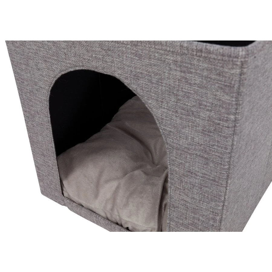 Schuilplaats Ella is een ligplek voor katten welke u eenvoudig overal mee naartoe kunt nemen. De box is namelijk makkelijk op te vouwen. De schuilplaats is gemaakt van geweven stof en polyester bekleding. Daarnaast bevat het een kussen met pluche bekleding (polyester) en polyestervlies vulling welke is doorgestikt. De box is makkelijk te plaatsen in bijvoorbeeld IKEA Kallax of Expedit kasten.