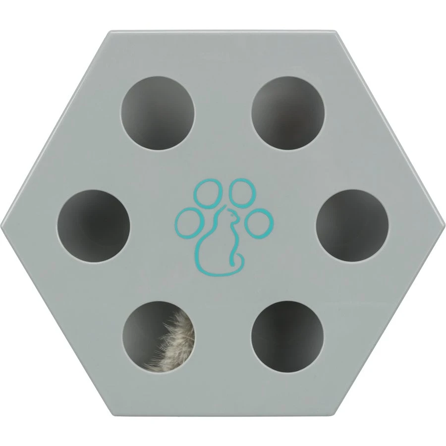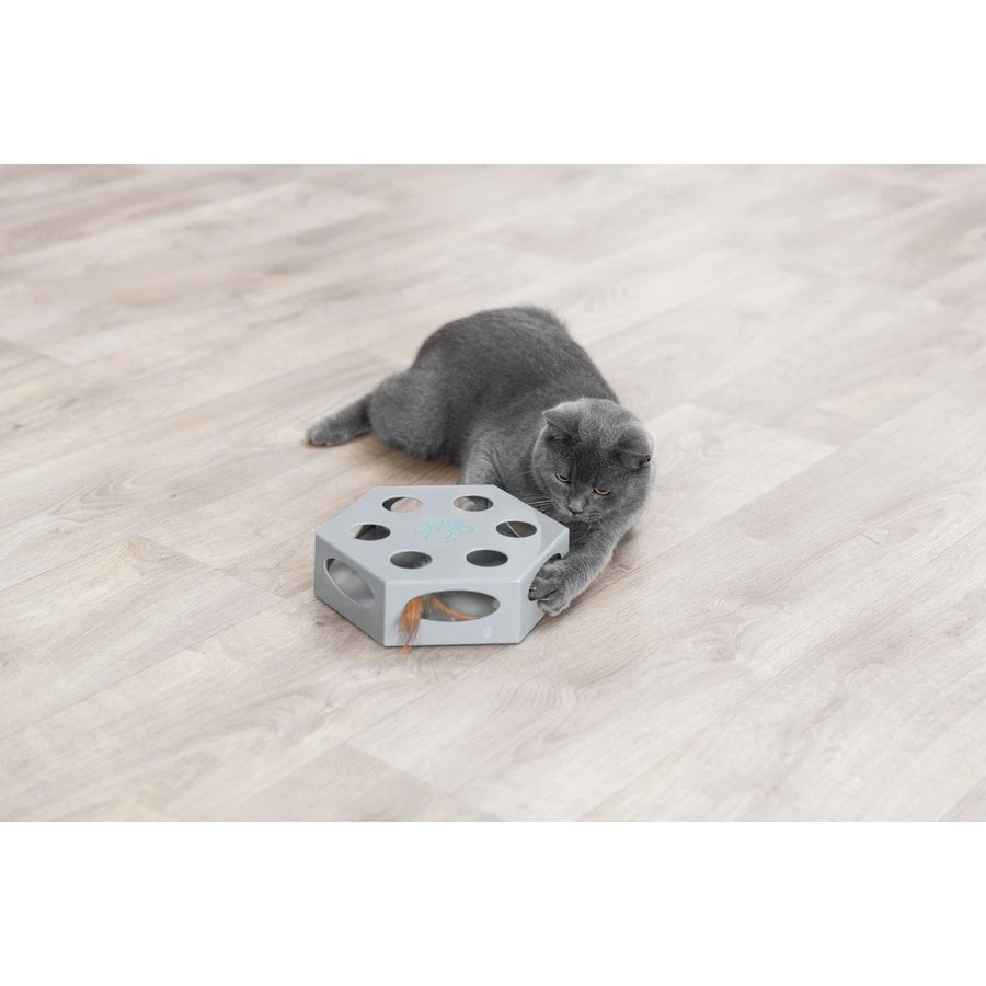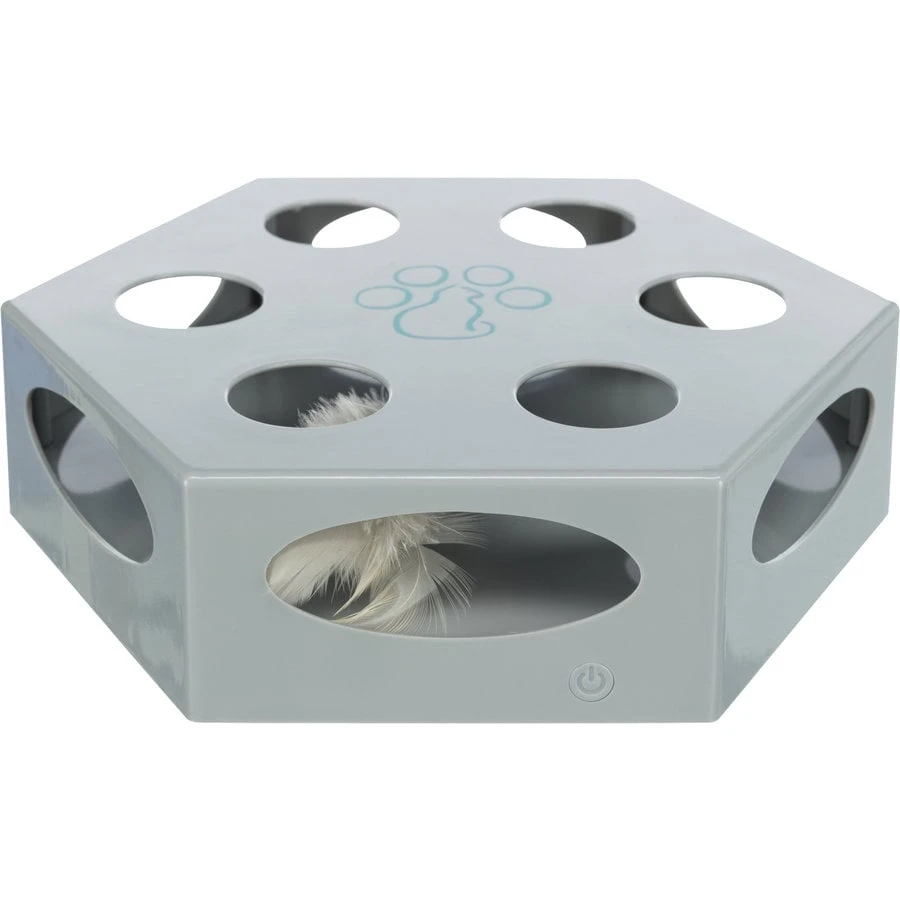 Deze elektrische Turning Feather bevat een veer binnenin welke heen en weer zwiept en ook willekeurig van richting veranderd. Daarnaast kan het apparaat gevuld worden met de kleine beloningssnoepjes van uw kat. Na ongeveer 15 minuten schakelt het apparaat vanzelf weer uit. Daarnaast is het slipvast door rubberen voetjes en werkt op batterijen (3 AA mignon batterijen niet inbegrepen). Het apparaat is gemaakt van kunststof en heeft een grijze kleur.